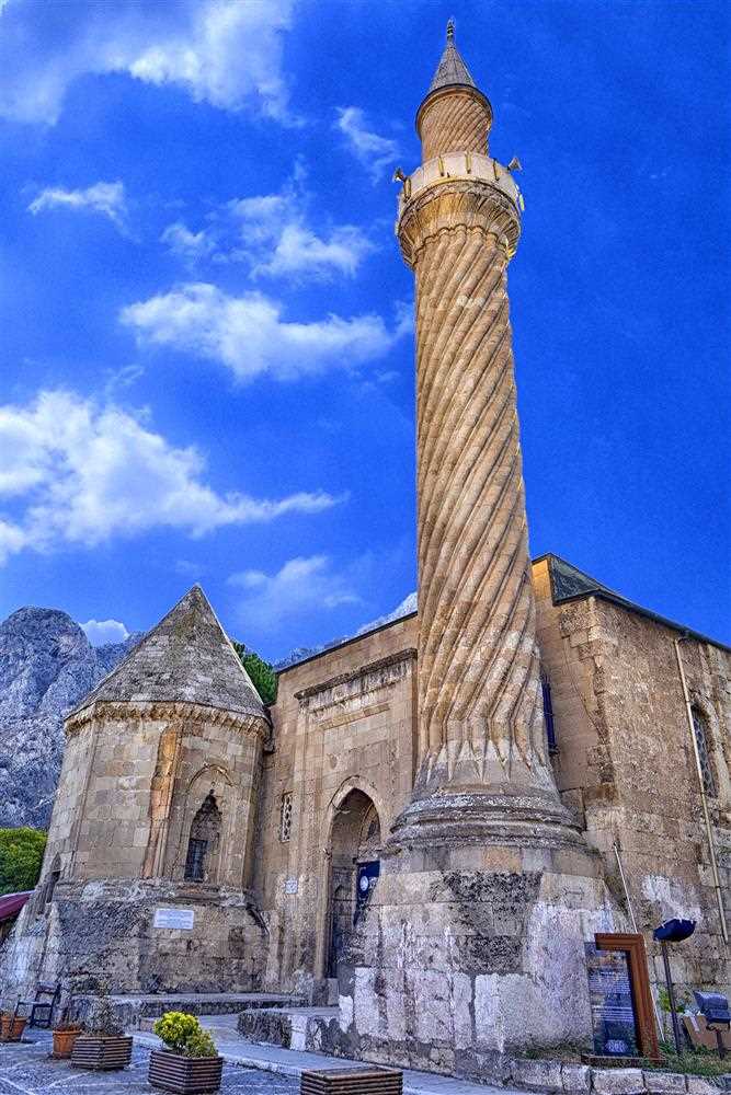 Caminin kapısı üzerinde bulunan kemer kavisi şeklindeki kitabeden Burmalı Minare Camisinin iki kardeş tarafından yaptırıldığı anlaşılır. Bu kardeşlerden Said Ferruh’un Selçuklu Sultanı II. Gıyaseddin Keyhüsrev’in vezirlerinden Necmeddin Ferruh Bey olduğu kabul edilmektedir. Kardeşi de Haznedar Yusuf’tur. Yapım tarihi kitabeye göre 1242 yılıdır. Günümüzde minaresinin şekliyle adlandırılan cami, Evliya Çelebi’nin, Seyahatname'sinde Mahkeme Camii ismiyle geçmekte ve cami minaresinin ahşap olduğu belirtilmektedir. 1590 yılındaki deprem ve 1602 yılında yaşanan yangında hasar gören caminin minaresi 1730 yılında yaşanan büyük yangında tamamen yok oldu. Bunun yerine yapılan minare bu kez caminin güçlü taş yapısına uygun biçimde taştan yapıldı. Dönerek minarenin etrafını dolanan yivlerin oluşturduğu bu yapıya bu zamandan sonra Burmalı Minare, camiye de Burmalı Minare Camii denmiştir.